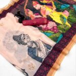 Elegant original linen saree with soft texture and graceful drape. It features artistic digital prints inspired by traditional paintings, giving it a unique and classy look. The saree has a contrast floral border in maroon with a golden edge, finished with tassels on the pallu for extra charm.